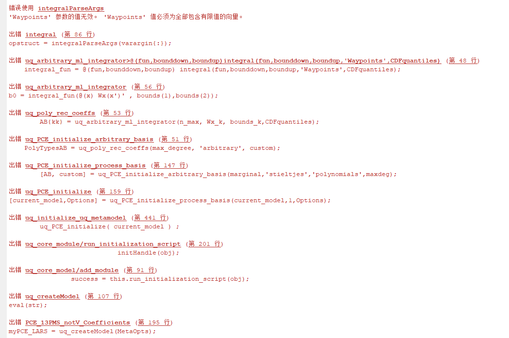 I am dealing with a 21-dimensional uncertain input problem. The inputs are all Gaussian distributed, and one of them is a negative number. I used the LARS method to expand it into a chaotic polynomial. When it is expanded into a Hermite polynomial, the program can run. However, when the polynomial is set to an arbitrary polynomial, the program will report an error. I took a quick look at the program and the reason for the error is that the program cannot handle the inverse cumulative distribution of negative inputs. So I would like to ask everyone how to deal with this problem.